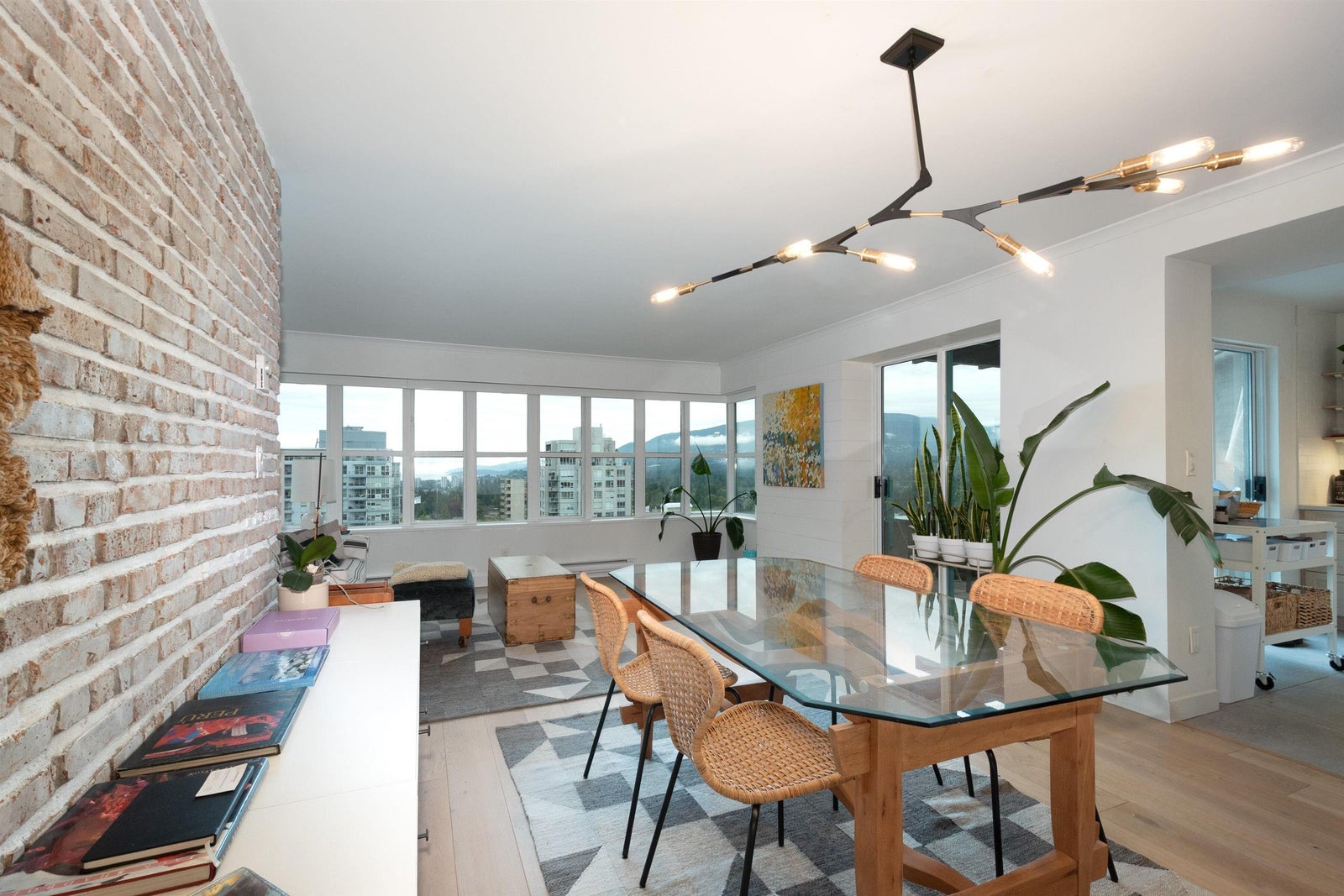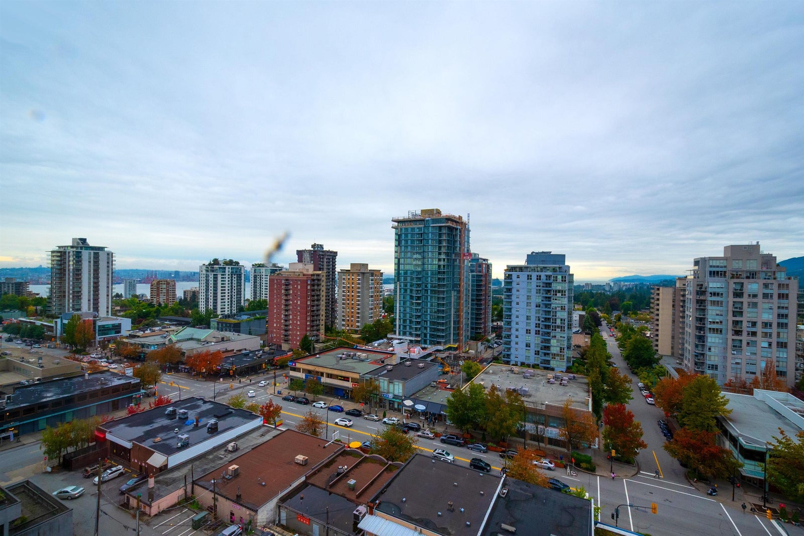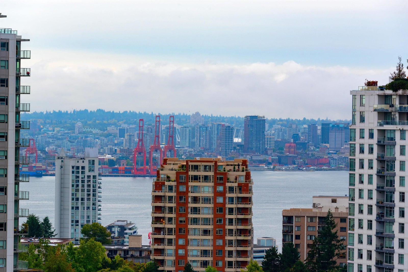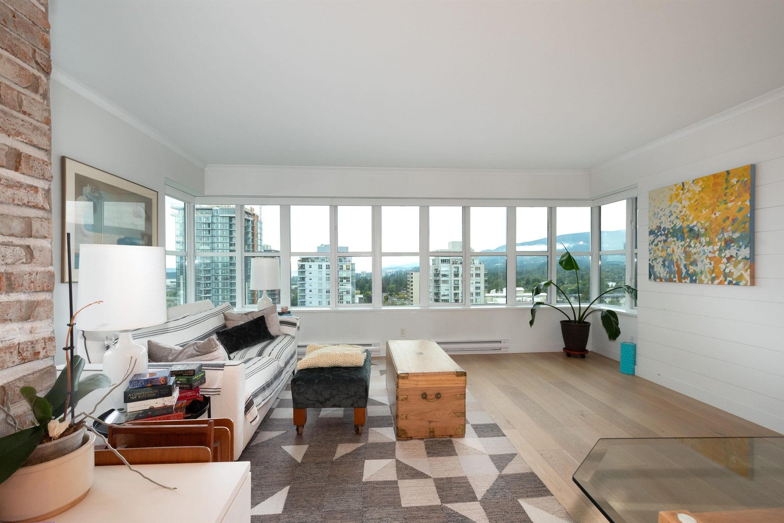 VIEWS to the South, West & North (180 degrees - STUNNING!). This fully renovated SOUTHWEST-facing sub-PENTHOUSE in a concrete, well-maintained RAINSCREENED building in the heart of Central Lonsdale offers sweeping VIEWS of the city, water & mountains. Almost 1,000 sq ft and boasting 2 bedrooms, 2 bathrooms & in-suite laundry. This home is beautifully painted, meticulously cared for, and move-in ready. The kitchen features Caesarstone counters & stainless steel appliances, while expansive west-facing windows flood the space with natural light. A semi-covered deck extends your living outdoors year-round. Steps to a park, brand new rec centre, hospital, shops, restaurants & cafes. 1 parking & 1 locker. OPEN HOUSE SUNDAY, OCTOBER 5 (2-4 PM).